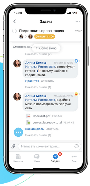 Создавайте задачу прямо из сообщения в чате, формируйте чек-листы, устанавливайте сроки, контролируйте выполнение.